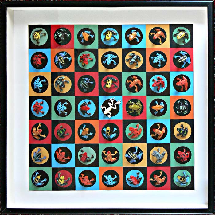My daughter gave me a "bucket o frogs" for Christmas. (plastic poison dart frogs purchased from Archie McFee, of course). I created this piece and ended up making two more for other friends. In a shadow box frame due to the depth.